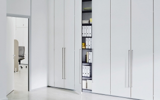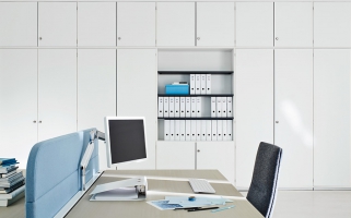 In der akustisch wirksamen Variante sind Flügeltürenschränke, Schiebetürenschränke und Querrollladenschränke erhältlich, mit Akustikfront und -rückwand. So sorgt die Linie S für Schallschutz im Büro.